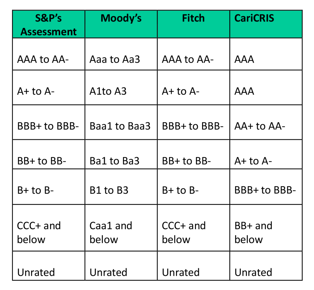 Regional scale ratings use the listed rating symbols with the prefix ‘Cari’ while national scale ratings use the above symbols with the prefix applicable for the respective national scale ‘bb’ for the Barbados national scale, ‘jm’ for the Jamaica national scale and ‘tt’ for the Trinidad and Tobago national scale.
